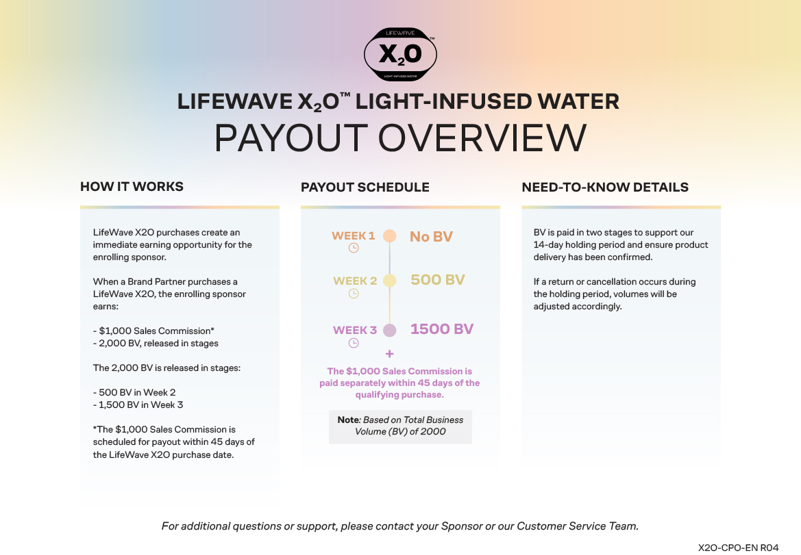 - $1,000 sales commission is granted to the sponsor when a new Brand Partner purchases LifeWave X2O. The commission is paid within 45 days of purchase.
